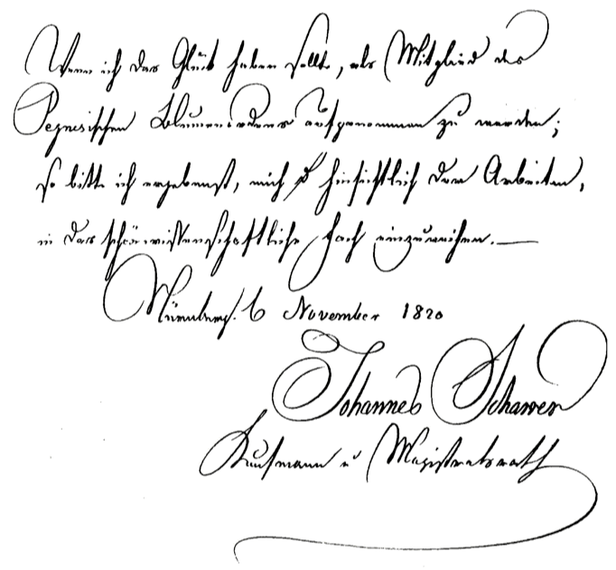 9.) trug Hr. Präses vor: eben als er aus dem Hause habe abgehen wollen, sey Hr. Diakon Roth gekommen und habe ihm einen Extract eines Schreibens des General-Sekretärs der Kön. Akademie der Wissenschaften in München, Herrn Schlichtegroll überbracht. Noch vor Ablesung desselben bemerkte Hr. Senator v. Löffelholz, daß Hr. v. Schlichtegroll bey dessen letzter Anwesenheit in München geäussert habe, er möchte nur in der nächsten Ordensversammlung seine Achtung für diesen litterarischen Verein bezeugen und zugleich melden, daß er dieAbsicht habe, ihn mit der Kön. Akademie dermassen in Verbindung zu setzen, daß künftig dem pegnesischen Blumenorden die Aufsicht über alle Literatur- und Kunstschätze Nürnbergs übertragen werden würden und deshalb in einem regelmäßigen Schriftwechsel sich gesetzt werden solle.