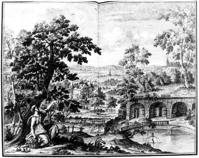 Vor dem Titelblatt ist ein doppelseitiger Kupferstich eingebunden, der hinter einem Barockgarten im Mittelgrund das Landschlößchen Haimendorf von Nordwesten und dahinter den Moritzberg mit seiner Kapelle zeigt, als einzigen Hinweis für den Ortskundigen, wer sich hinter dem Hirtennamen verbirgt.