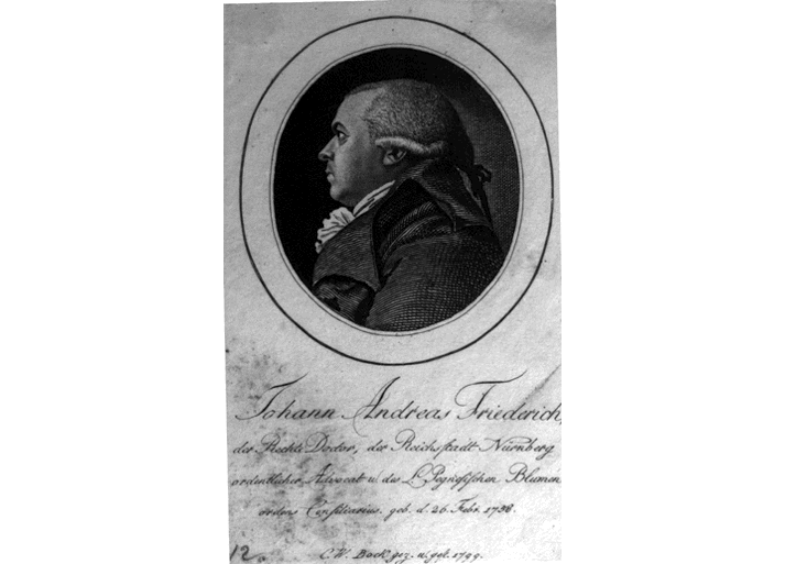 Friederich war etwa ein Altersgenosse Schillers, geboren am 26. Februar 1758. Sein Vater war "Großpfragner" (Lebensmittel-Großhändler) und Salzhändler. Es war nicht selbstverständlich, daß man bei solcher Herkunft Jura studierte. Er war eben ein tüchtiger Schüler und fand Gönner. Schon auf der Schule war er übrigens mit Link zusammen. Später studierte er eine zeitlang in Jena, dann wieder in Altdorf. 1781 begann er seine Berufslaufbahn als "außerordentlicher Advokat" in Nürnberg, wurde bereits ein Jahr später als "ordentlicher Advokat" zugelassen und konnte in dieser Stellung ans Heiraten denken. Seine Erwählte war die älteste Tochter "des ehemaligen Vorstehers des Pegnesischen Blumenordens, des verstorbenen Doctors und Professors der Theologie, Johann Augustin Dietelmairs zu Altdorf." Hieraus erklärt sich zum guten Teil, wie die "teutsche Privatgesellschaft" später zum Blumenorden kam; was an der Erklärung noch fehlt, ergibt sich aus Friederichs Charakter: Er war ein leidenschaftlicher Pläneschmied, um nicht zu sagen Intrigant, und als Jurist ein Naturtalent. "Während Link ängstlich über dem Buchstaben des Gesezes brütete, spührte Friederich dem Gange der Cabale nach, und während Jener an einer gelehrten Deduction arbeitete, hatte dieser mittelst seiner Welt- und Menschenkenntnis die Cabale erreicht und durch Beredsamkeit besiegt. In den meisten Processen, von welchen ich weiß, daß Friederich Links Gegner war, verlohr Lezterer; [...]"