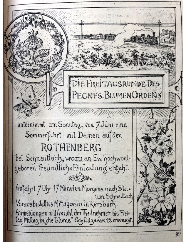 […] Dr. Beckh übergibt das Buch „Der deutsche Palmbaum-Orden“ welches interessante Werkchen er für den Blumenorden billig zu kaufen Gelegenheit hatte; […] eingelaufene „Wiener Schriftstellerzeitung“ soll, wenn Zusendung nicht [gestrichen: „gratis“] unentgeltlich erfolgt, abbestellt werden. […]