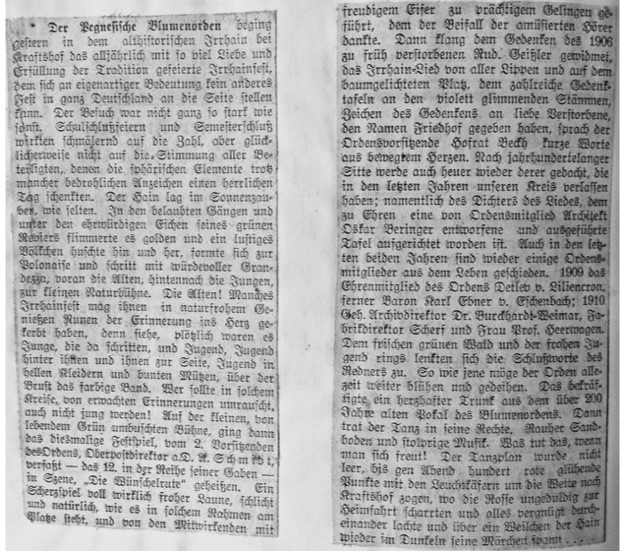 Daß ein solches Fest überhaupt gefeiert werden konnte, gehört zu den Dingen, die, wie Bayreuth, Oberammergau, Weimar, unserem deutschen Leben einen besonderen Reiz leihen und uns beinah mehr als unsere Schlachten-Siege (die schließlich andere auch haben) beneidet werden. Eigenart ist das Einzige, was an Völkern interessirt und diese selbstständige Physiognomie lebt vor allem in Dingen und Erinnerungen, wie sie sich gerade im schönen Nürnberg so wirklich finden, darunter auch in seinem Pegnesischen Blumenorden.