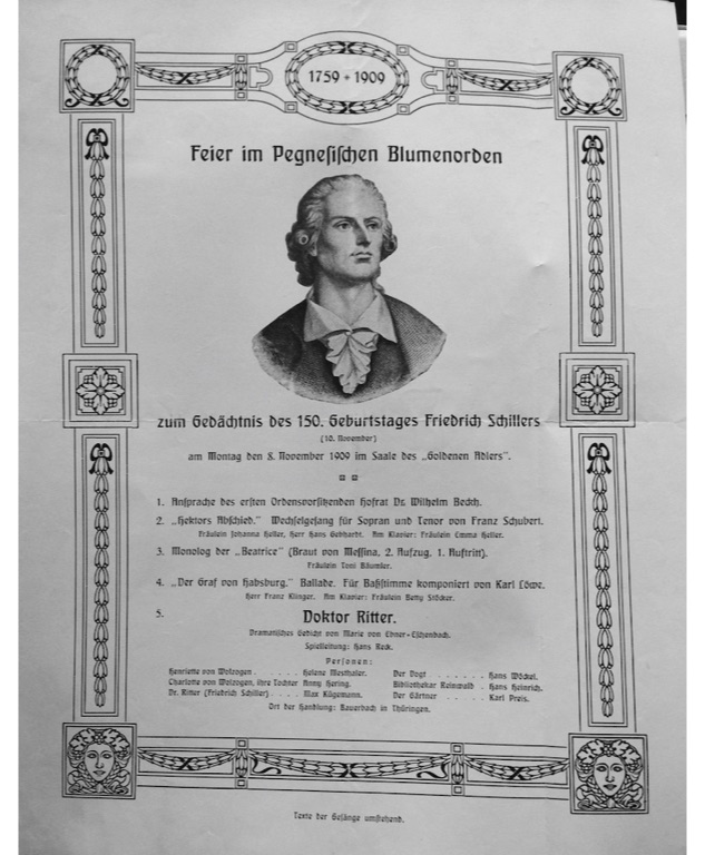 Auch die Mitgliedschaft des erfolgreichen Romanautors Friedrich Spielhagen war eine Errungenschaft des Ordensjubiläums. In seinem Dankschreiben vom 21. 9. 1894 bringt er eine bemerkenswerte Perspektive zum Ausdruck, aus der seine Ernennung eine Art überregionale Versöhnung des unter Preußens Führung vereinigten Kleindeutschlands erweise: „Es bedarf wohl keiner besonderen Versicherung, daß mich die Ehre, zum Ehrenmitglied des altehrwürdigen Pegnesischen Blumenordens erkoren zu sein, mit hoher Freude erfüllt und ich das werte Geschenk mit aufrichtiger Dankbarkeit annehme. Mit um so aufrichtigerer und größerer, als ich in jeder Anerkennung, die mir aus Süddeutschland wird, den Beweis zu sehen wage, daß ich, der Sohn Norddeutschlands, als Schriftsteller nicht vergebens danach gestrebt habe, das Denken und Empfinden Alldeutschlands zum Ausdruck zu bringen.“ Einmal noch wird sein Name im Protokoll einer Wochenversammlung erwähnt, als es darum geht, Beiträge für eine Fortsetzung der Aufsatzsammlung „Altes und Neues aus dem Pegnesischen Blumenorden“ zu erbitten, dann nicht mehr.
