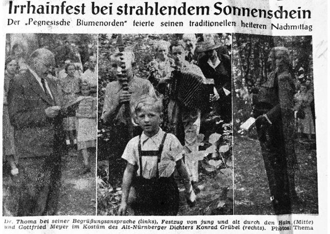 Am 14. Juni traf sich die Vorstandschaft bei Herrn Pfarrer Türk mit Herrn Professor Döbereiner, um nun der Gestaltung eines größeren Festabends zur 300 Jahrfeier, die für den Herbst oder frühen Winter geplant war, näher zu treten. Döbereiners Vorschlag war […] mit seinem Chor das Fest zu umrahmen, daß man mit einem kurzen Instrumentalstück von Johann Staden beginnen möge, anschließend einen mehrstimmigen Chor bringen würde, dann käme ein kurzer Vortrag des Ordensvorstehers über den Blumenorden, hierauf sollten Teile aus „Seelewig“ von Ph. Harsdörfer […] gesungen werden […] und endlich sollte ein Madrigalchor von Staden „Der Kuckuck und die Nachtigall“ gesungen werden. […]