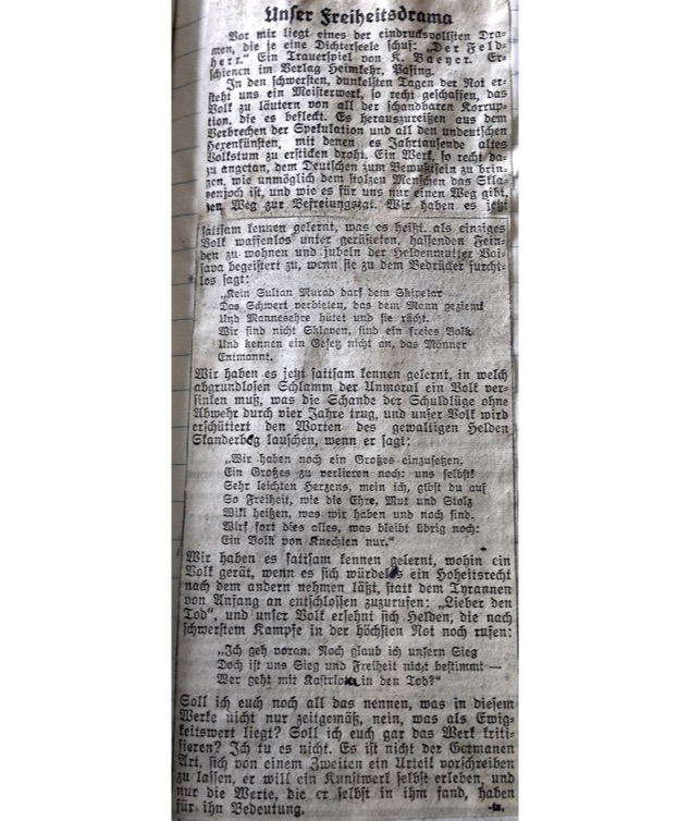 Dem Prologe folgte ein Vortrag des 2. Ordensvorstandes Hrn. Dr. Chr. Behringer über das Thema „Vaterländische Dichtung der Jetztzeit“. […] weggefegt ist all der fremde Wust, dem unser Volk oft gar so willig die Türe geöffnet hatte. Männer wie Gerhart Hauptmann, der in seinem unglücklichen Festspiel „1813“ dem vaterländischen Thema nicht gewachsen war, schmiedet Verse von einer Glut und Wucht, die Zeugnis von einer gewaltigen und alles opfernden Vaterlandsliebe ablegen — Ludwig Thoma, Cäsar Fleischlen, Rudolf Herzog, Hermann Sudermann, Karl Henkel [sic] und andere schließen sich ihm kraftvoll an; der höchste Idealismus ist in ihnen erwacht […] mit jenen herrlichen Worten eines schlichten Mannes aus dem Volke „Deutschland muß leben, auch wenn wir sterben müssen!“ einen überaus stimmungsvollen Abschluß fanden. […]
