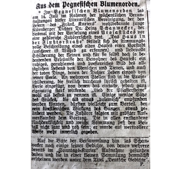 […] Die als Verbindungsglied gedachte Würdigung Hans Sachsens durch Dr. Behringer, mit schwungvollem poetischem Hinweis eingeleitet, mochte manchen die Beziehungen zur Gegenwart vermissen lassen: über den Wert des anspruchslosen Vortrages wollen wir hier nicht mäkeln. […] Der Blumenorden wird jedenfalls zielbewußt seinen Weg verfolgen, anspruchslose Hörer am echten Born guter deutscher — alter und neuer — Literatur zu erquicken und zu stärken in den Nöten der Zeit. […]